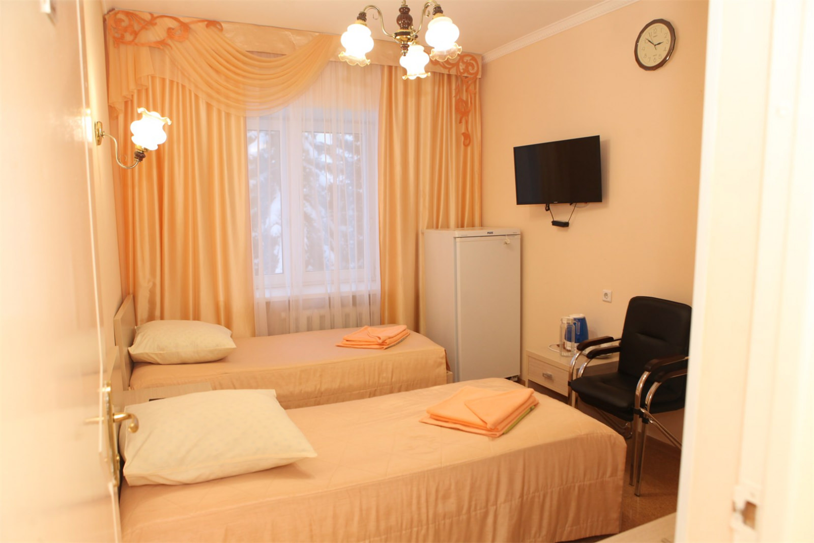 Площадь номера - 12 кв.м. 2 осн. места. Мебель: зеркало, кровати односпальные, прикроватные тумбочки, стол, стул, шкаф. Оборудование. Санузел на блок. Сервис: Wi-Fi бесплатно, смена полотенец, смена постельного белья, уборка номера.
